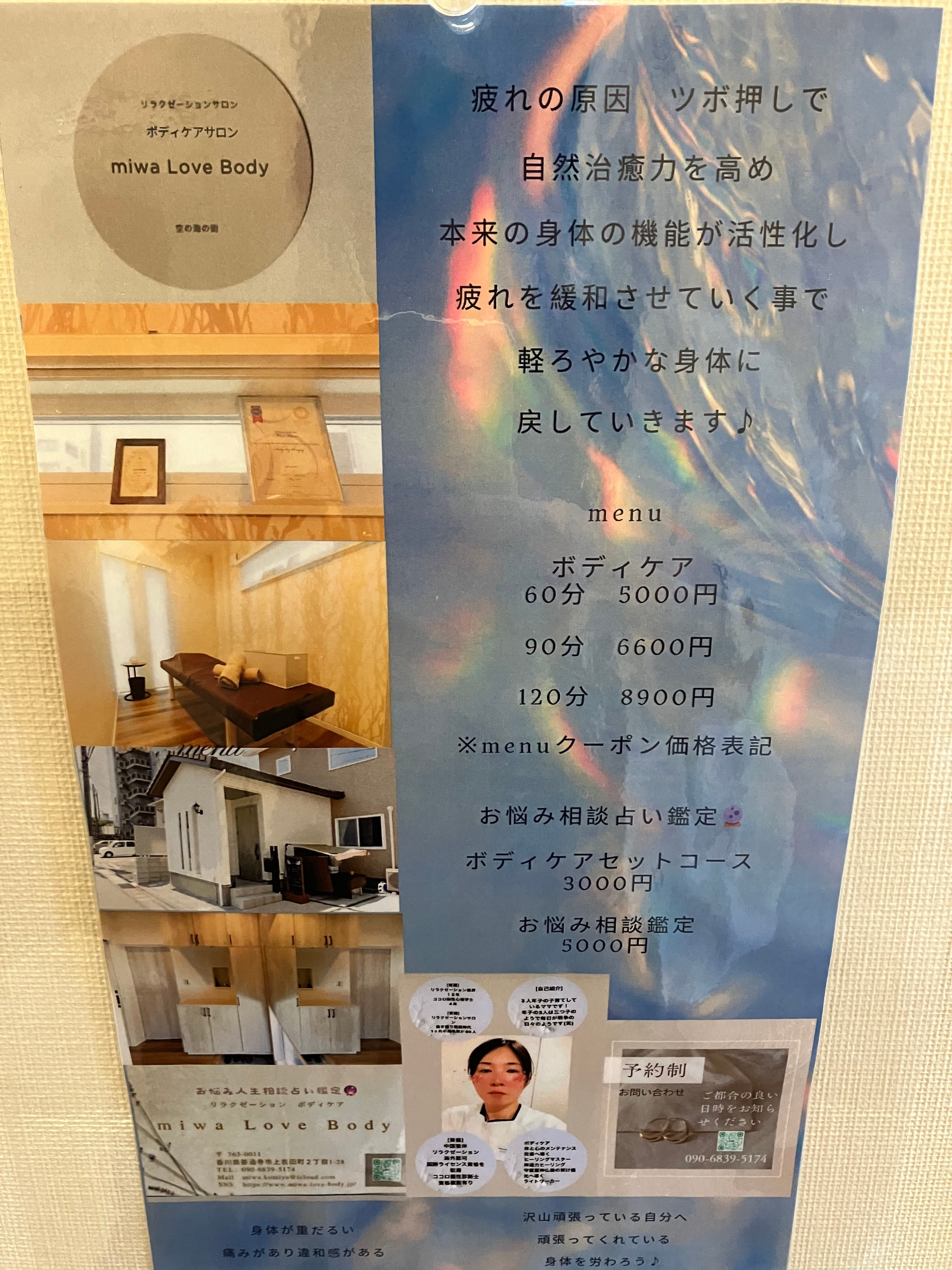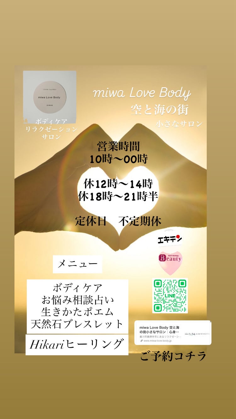 miwaLove Body 空と海の街のリラクゼーションサロン 香川県善通寺市上吉田町2丁目1-28 ⭐︎改善したいお身体の疲れの症状や箇所を教えてください!! ⭐︎60分コース ⭐︎コースは変更可能 ⭐︎疲れの症状に合わせてコース決めが可能 [コース内容] ボディケアマッサージ揉みほぐし コース種類 ・30分部分コース ・60分全身コース ・90分疲れ多めコース ・120分疲れ激多コース ・50分セットコース ハンドリフレ又フットリフレ20分 ➕ボディ40分組み合わせ ・80分セットコース ハンドリフレ又フットリフレ20分 ➕ボディ60分組み合わせ [セットコースボディケアと組み合わせ種類] ハンドオイル/フットオイル/ストレッチ/ヘッド首/フェイス ⭐︎商品説明⭐︎ お身体の疲労部分を揉みほぐすボディケア ・ボディケアマッサージのみ ・プラスにハンドリフレやフットリフレの組み合わせのセットコースもございます。 ⭐︎効果の期待⭐︎ 疲労回復、健康促進、健康維持、免疫アップ、身体の毒素排出にも効果的!! 病気知らず 介護入らずへ