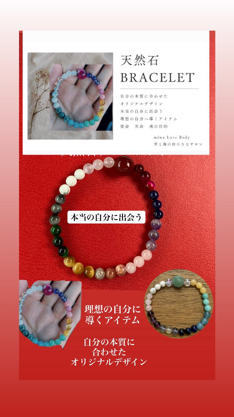 天然石Bracelet 自分の本質に合わせた オリジナルデザイン 本当の自分に出会う 使命、天命、魂の目的 カラバ数秘とココロ個性学 理想の自分へ導く運命を変えるブレスレット **天然石ブレスレット オーダーメイド オリジナルデザイン** あなたの個性を引き立てる、世界に一つだけのブレスレット! ⭐︎オリジナルデザイン ⭐︎天然石の選択可能 ⭐︎サイズ調整が可能 [商品説明] この天然石ブレスレットは、あなたの想いを込めたオーダーメイドの商品です。お好きな天然石を自由に選び、あなただけの特別なデザインを作り上げることができます。ストーンの組み合わせや配置はあなた次第です! [ブレスレットの特徴] ・厳選された天然石を使用 ・デザインは完全オリジナル ・サイズ調整が可能で、どなたでもフィットします ⭐︎デザインする楽しさ⭐︎ 自分の感情や願いを反映させたデザインで、毎日身に着ける喜びを味わえます。お友達へのギフトや特別な日のプレゼントにもぴったりです! ⭐︎効果の期待⭐︎ 天然石にはそれぞれエネルギーが宿っています。自分にぴったりの天然石を選ぶことで、心の安定やポジティブなエネルギーを引き寄せる手助けになります。日常の中で大切なメッセージを感じとることができるでしょう! あなたの個性と願いを形にした天然石ブレスレットで、心豊かな毎日をお楽しみください!✨