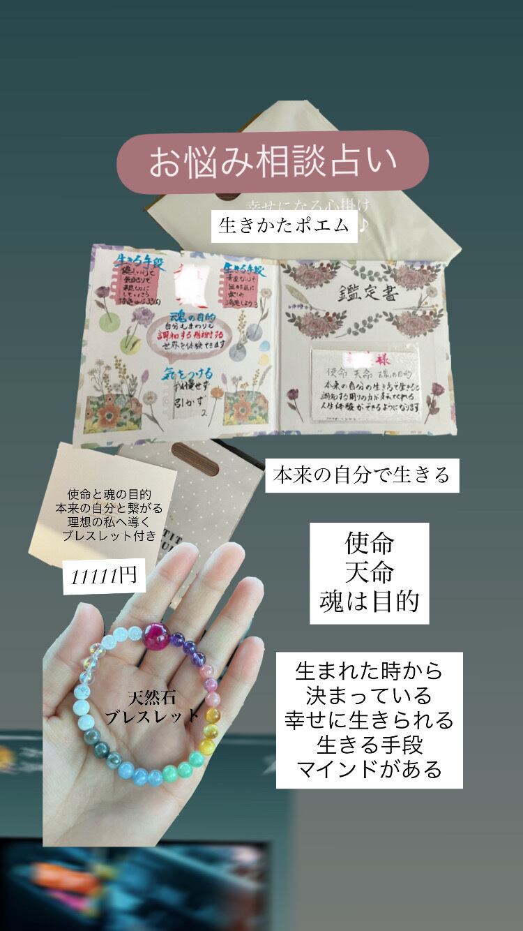 生きかたポエム プレゼント用/個人用/家族用 [使命天命魂の目的をお伝えします] 本来の自分で生きる事が出来ると幸せに導かれる宇宙しくみ 本来の自分で生きる手段マインドは どんな特徴があるのかご存知でしょうか? ご自分が何を体験したいと自分の魂は求めているのか知っていますか? どういう生き方を運命を変えられるのか 感謝を感じられ心からの喜びを感じられるのか知っていますか? 生きる手段と魂が求めている世界を体験する事で幸福感へと軽やかに楽しく生きられるようになります♪ 生きかたポエム 今必要なメッセージカード付き 守護霊神仏様によりメッセージを下ろします [ポエムを描く必要な情報] お名前 生年月日 家族用/1人用/ペア用/プレゼント用 ※作品により料金が異なりますのでお問い合わせください! 心に響く言葉が詰まった 「使命天命魂の目的を描いた生きかたポエム」。 あなたの人生に大きな影響を与える 運命を変えるお手伝いとなることでしょう。 このポエムには、あなたがが本当に求める 人生を実現するために大切なヒントが詰まっています。 あなたがこれまで何度もあきらめかけた道でも、このポエムを読めば次に進む勇気が湧いてくることでしょう。 このポエムは、著者の数々の試行錯誤の末に生まれました。魂の深層にある目的を探求し続けた著者が、その答えを見つけ出すために書いた言葉が、ポエムに収められています。 あなたもこのポエムを手にして、自分自身に向き合ってみませんか?自分の魂を確認し、目標を明確にしたい方におすすめです。このポエムが、あなたの人生に素晴らしい変化をもたらすことを願っています。 ※本商品は心に深く響く内容を含んでいるため、身体的、精神的な問題を抱えている方、また若年層の方はお控えください。 心に響く言葉が詰まった「使命天命魂の目的を描いた生き方ポエム」。あなたの人生に大きな影響を与えることでしょう。このポエムには、あなたが本当に求める人生を実現するために大切なヒントが詰まっています。あなたがこれまで何度もあきらめかけた道でも、このポエムを読めば次に進む勇気が湧いてくることでしょう。 このポエムは、著者の数々の試行錯誤の末に生まれました。魂の深層にある目的を探求し続けた著者が、その答えを見つけ出すために書いた言葉が、ポエムに収められています。 あなたもこのポエムを手にして、自分自身に向き合ってみませんか?自分の魂を確認し、目標を明確にしたい方におすすめです。このポエムが、あなたの人生に素晴らしい変化をもたらすことを願っています。 ※本商品は心に深く響く内容を含んでいるため、身体的、精神的な問題を抱えている方、また若年層の方はお控えください。 「使命天命魂の目的を描いた生き方ポエム」は、あなたが本当に望む幸せな人生を歩むための一歩となるアイテムです。 この生き方ポエムは、自己分析や自己啓発の手助けとなる情報を描いております。あなたがやりたいこと、達成したいことにフォーカスをあて、それを実現するためのヒントやアドバイスが詰まっています。 自分自身を客観的に捉え、世界と向き合うためのツールとして活用してください。このポエムを読めば、自分が求めているものが何なのかが明確になり、あなたが望む人生を生きるための手段を模索できるようになるでしょう。 使命天命魂の目的を描いた生き方ポエムは、あなたの人生に新たな気づきをもたらし、今までにない視点で生きることができるように導いてくれます。あなた自身の生き方のメッセージが書かれたこのアイテムで、自分自身と向き合い、より幸せで充実した人生を歩んでください。 ※商品は印刷物ですので保管にもご注意ください。